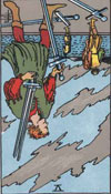 あなたは、転勤後すぐに彼がプロポーズしてくれると思っていたのに、転勤して1年以上が経つのにプロポーズしてくれないことに失望しています。約束を破られたような気持ちにさえ、なっているのではないでしょうか。それどころか別れを切り出されることを恐れています。まさにこのカードの絵のように、剣を何本も刺されている気持ちでしょう。